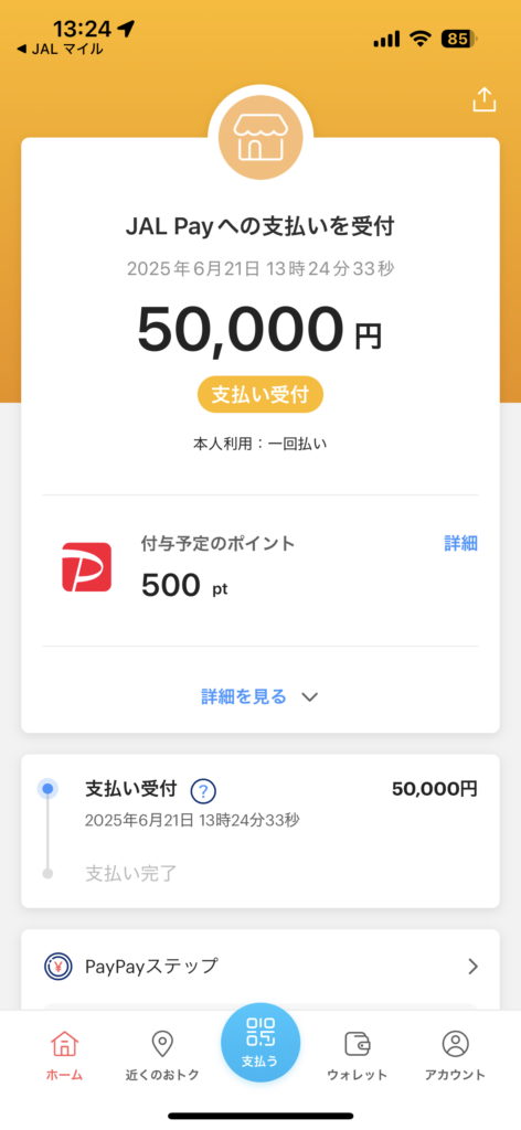 | PayPayポイント:1% | 500ポイント (JAL Payへ50,000円チャージ) | 1,830ポイント |