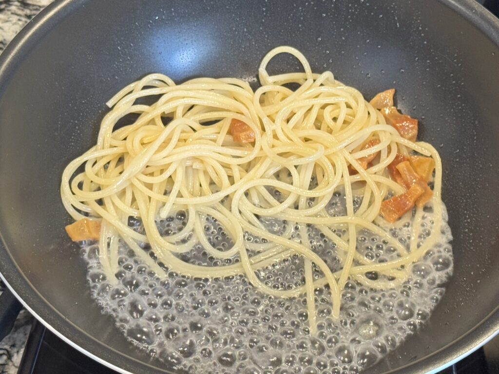カチョ・エ・ペペと同じく、茹で汁をフライパンに加えてグアンチャーレの脂と乳化をさせます。