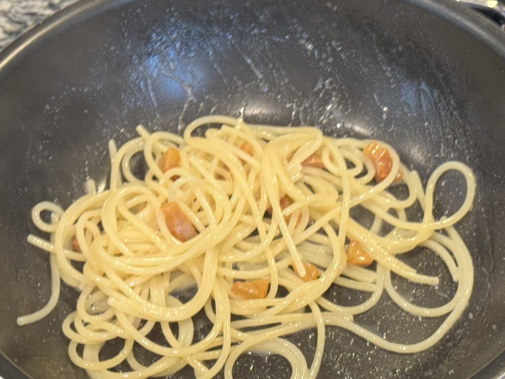 そして規定の茹で時間の1分ほど前で上げたパスタを投入して、火にかけてソースベースとしっかり混ぜ合わせます。